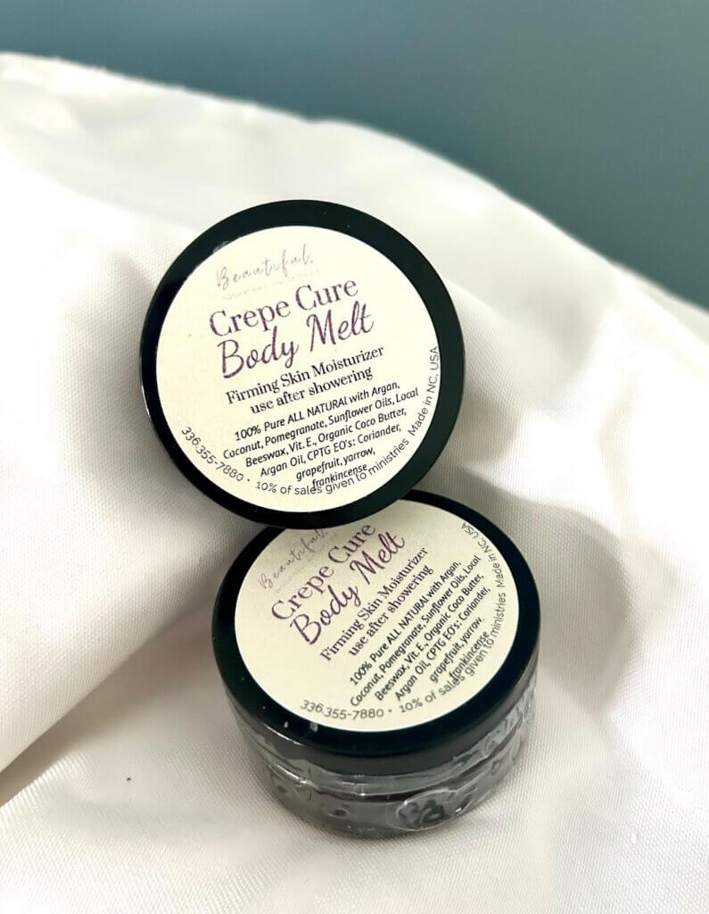 Crepe Cure Body Melt feels like silk gliding onto your skin. Use it just after you finish your shower while your skin is still warm. Scoop up a dime-size amount and spread this on your arms, legs, and anywhere you want to lock in moisture and reduce sagging “crepe” skin. Helps reduce cellulite. Enjoy your silky, soft skin with a hint of sheen and skin vibrancy.